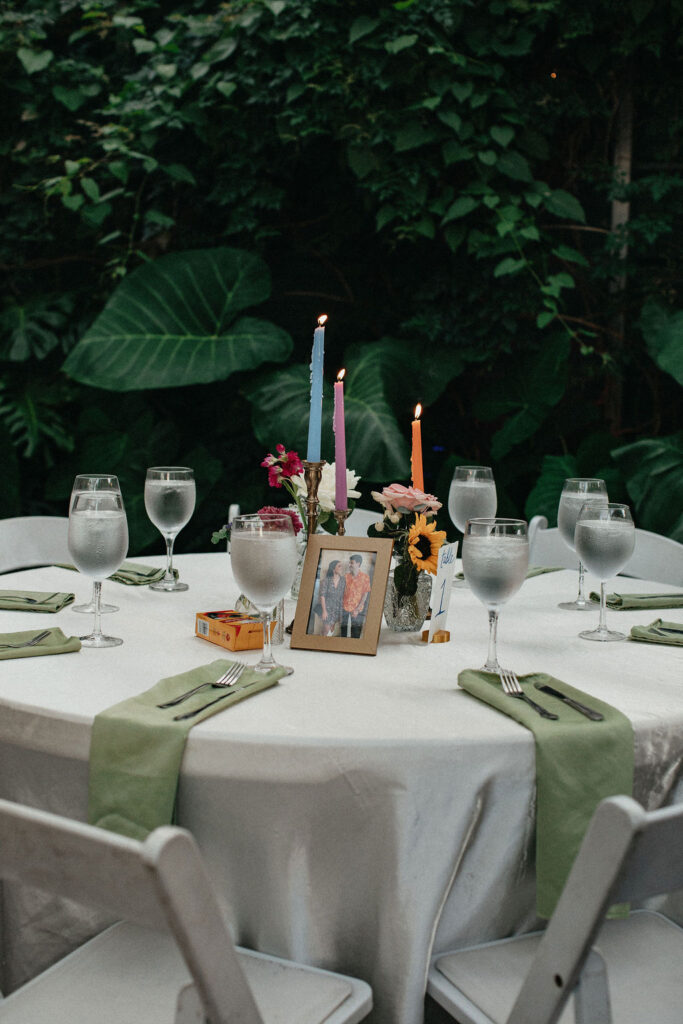 The reception took place under twinkling lights, surrounded by greenery that makes AvantGarden one of the most inviting garden wedding venues in Houston TX. Tables were styled with crisp white linens, soft sage-green napkins, and colorful tapered candles that echoed the bold florals beautifully. Guests enjoyed dinner from a taco truck before gathering for a three-tier wedding cake adorned with cascading wildflowers — a stunning focal point that tied the entire design together.