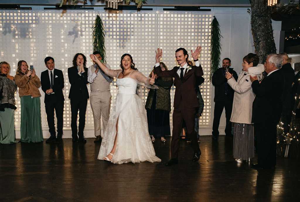 Grace’s brother officiated the ceremony, fighting back tears as he guided them through their vows — pausing, smiling, and taking deep breaths as guests quietly cheered him on. It was heartfelt, real, and unforgettable. Adding a perfect touch of levity, Grace’s mom stole the show as flower girl, confidently scattering petals down the aisle with full theatrical flair and earning big laughs from the crowd.
