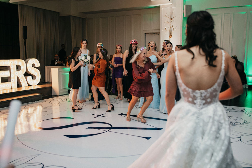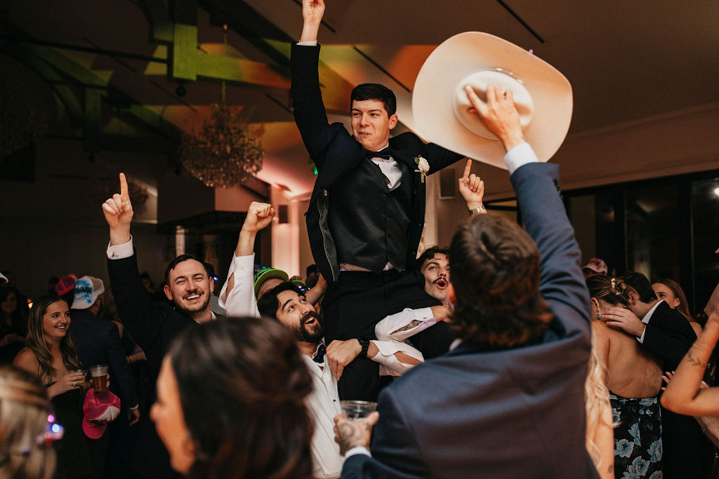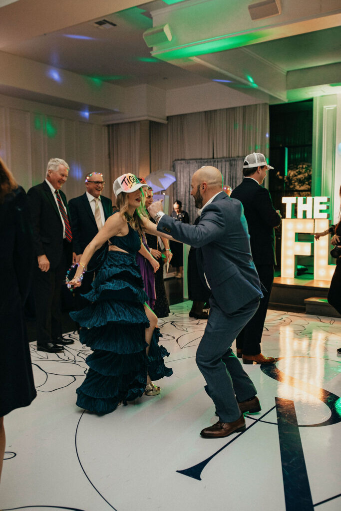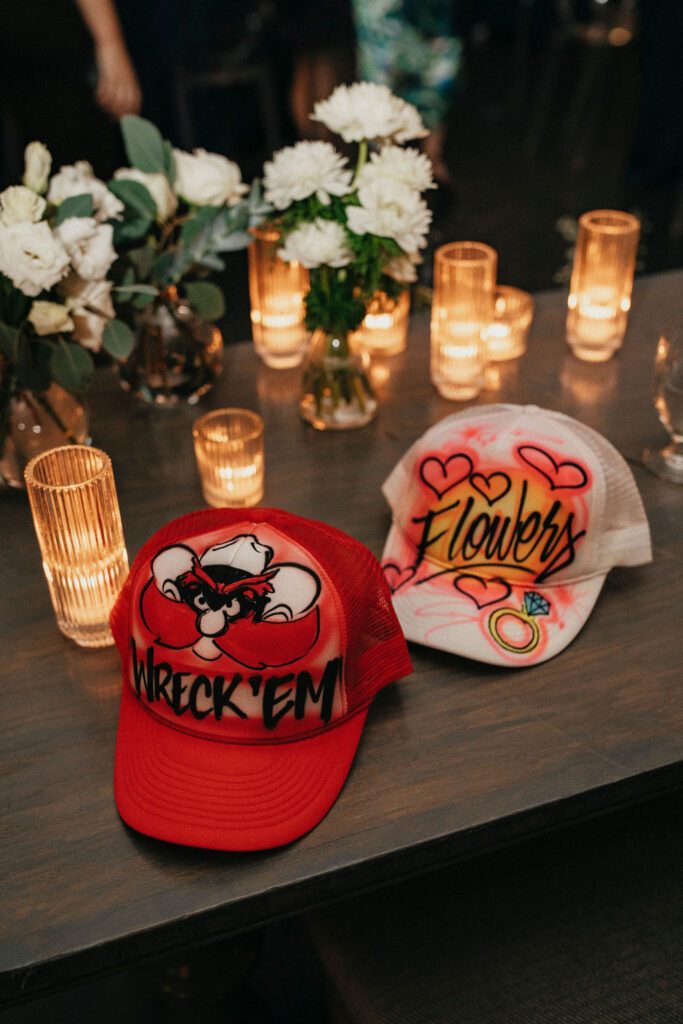 From the moment the dance floor opened, it stayed packed. Friends and family brought the energy all night long, celebrating in a way that felt effortless and contagious. Personalized airbrushed hats doubled as party favors and immediately became part of the dance floor vibe, equal parts creative, nostalgic, and fun. This wasn’t a “wait until the end of the night” kind of party. The celebration started early and never slowed down.